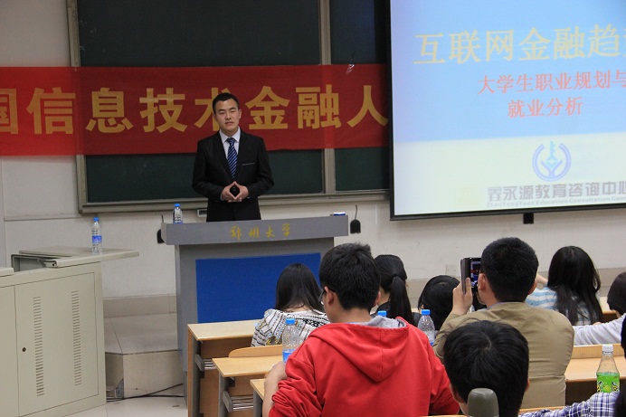 2014年3月28日,郑州錱永源教育咨询中心在郑州大学商学院为金融学、会计学、工商管理学等五个专业的同学举办了主题为“互联网金融趋势下的大学生职业规划与就业分析”的讲座,旨在为同学们授业解惑,指点迷津。