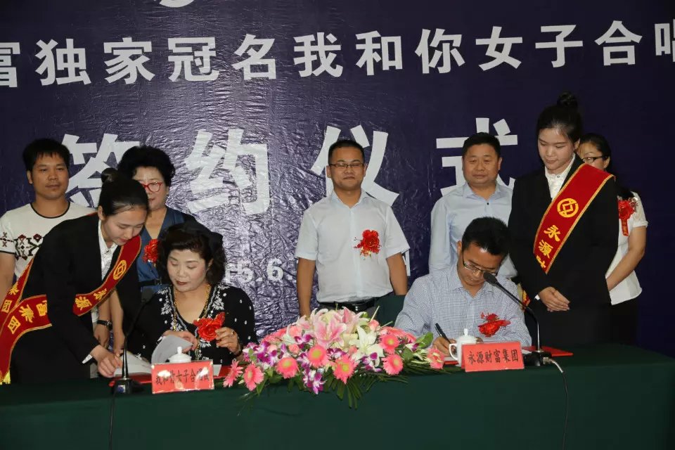 签约仪式于6月30日下午16:00在河南饭店礼堂举行,合作双方——“永源财富集团”创始人李勇先生与“我和你女子合唱团”团长何静女士分别致词。
