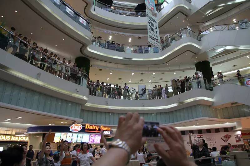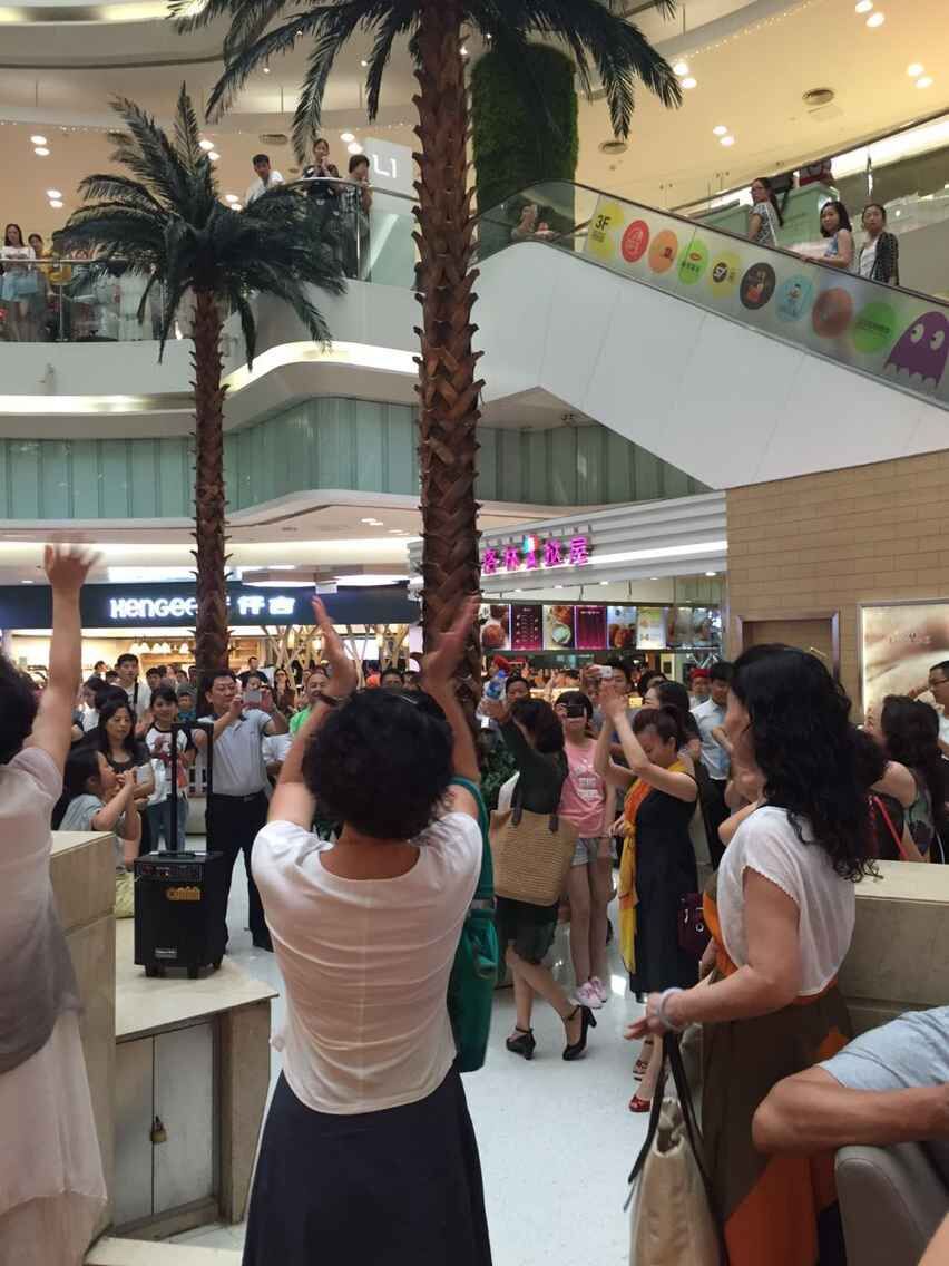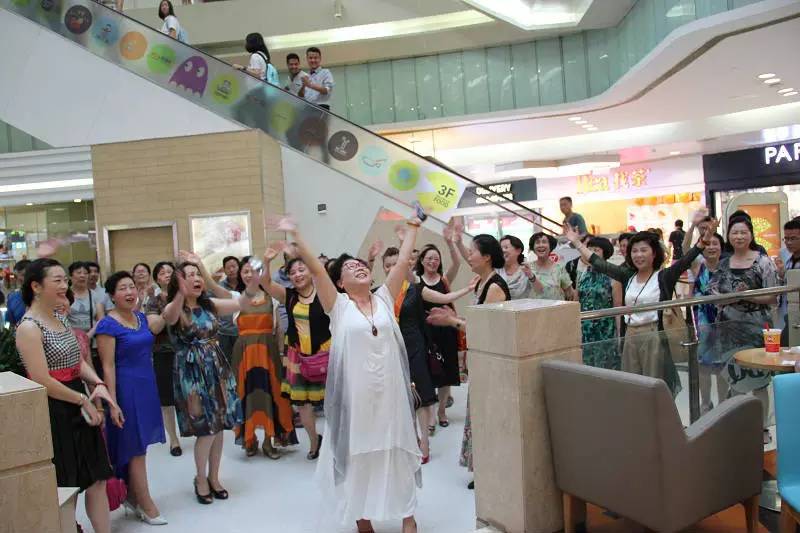 原来是永源财富·我和你女子合唱团在这里玩合唱快闪。她们在人群中突然驻足,然后几个人放声歌唱,歌声嘹亮动听,带给路人惊喜和音乐的艺术享受。唱到兴致高昂之处,从商场三楼围栏处垂下两个大大的红色条幅“永源财富·我和你女子合唱团,放歌美丽郑州唱响红色情怀”,购物人群中爆发出一阵赞叹之声。歌唱快闪结束之后,许多市民仍然意犹未尽不肯离去,还在回味刚才的节目。