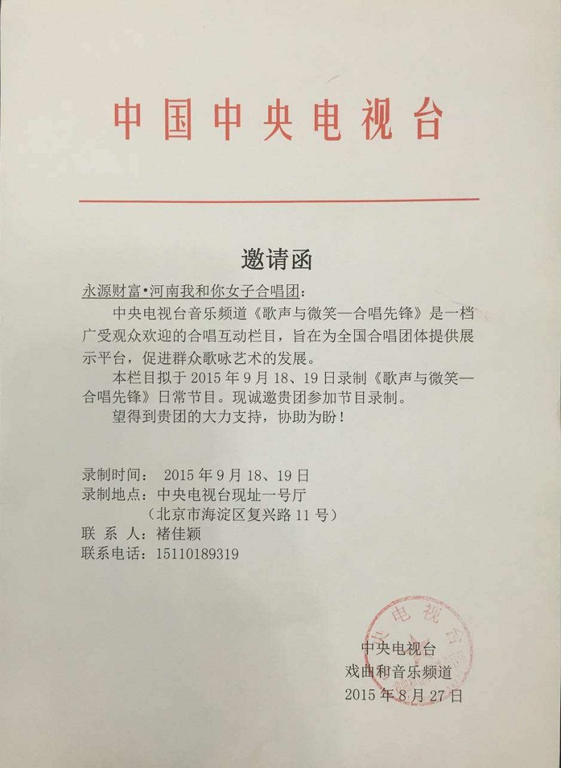 8月27日,中央电视台戏曲和音乐频道《歌声与微笑——合唱先锋》栏目正式向永源财富·我和你女子合唱团发出邀请函,邀请参加9月18日、19日的节目录制。永源财富员工及合唱团成员激动万分,长期的努力终于得到了高度肯定。这是河南合唱界业余团队中,第一支获准参加央视节目的中老年合唱团队,怎能不让人为止赞叹。